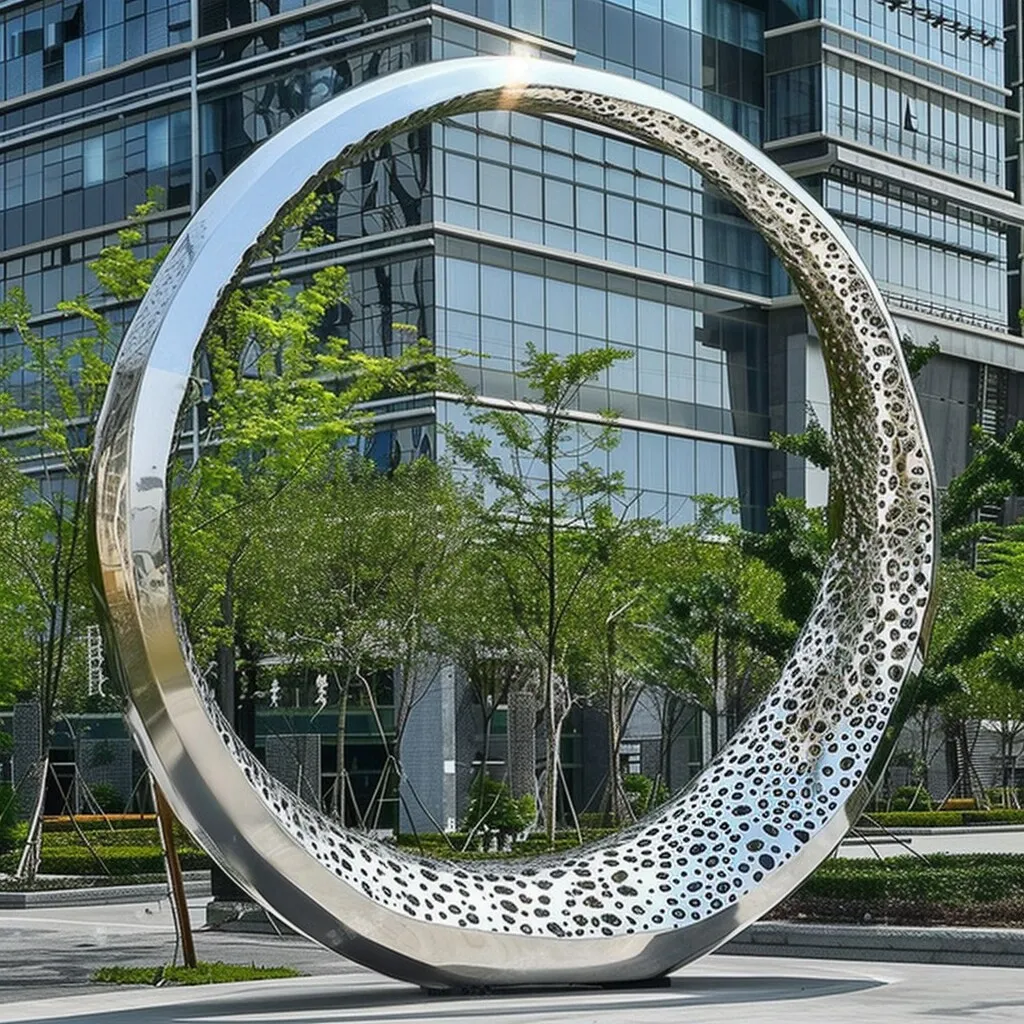 The stainless steel hollow metal ring sculpture is a model work that perfectly integrates modern art and practical design. With its unique shape and exquisite craftsmanship, it stands out in the urban landscape. This sculpture not only showcases the texture and beauty of the material but also expresses the concept of modern art through ingenious design.