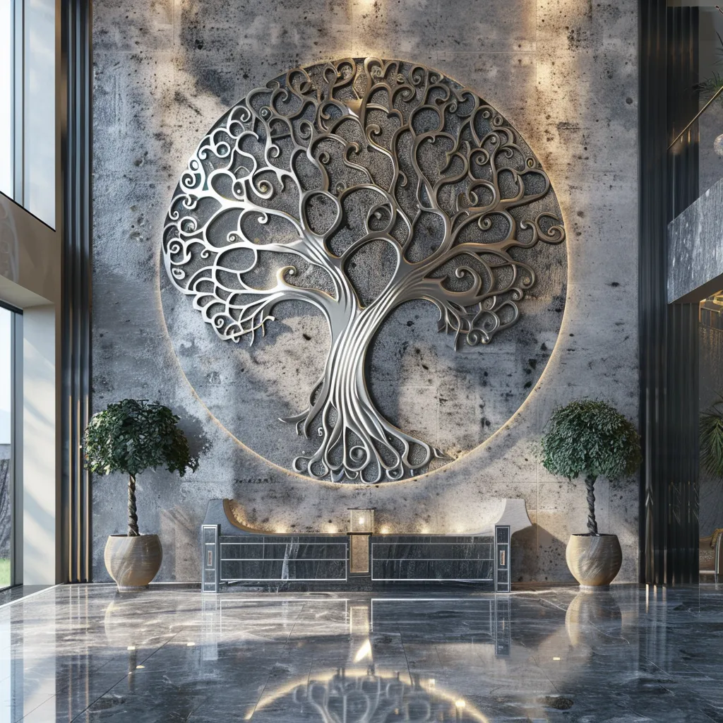 Crafted from premium 304/316 stainless steel, this metal tree of life wall sculpture balances durability with breathtaking detail. Artisans laser-cut each curve with precision, hand-polish the surfaces, and refine them with mirrored or brushed finishes. A large metal tree wall sculpture where sharp geometric frames contrast elegantly with organic, flowing branches. Ideal for tall ceilings or expansive walls, it becomes a radiant focal point that captures light and emotion.