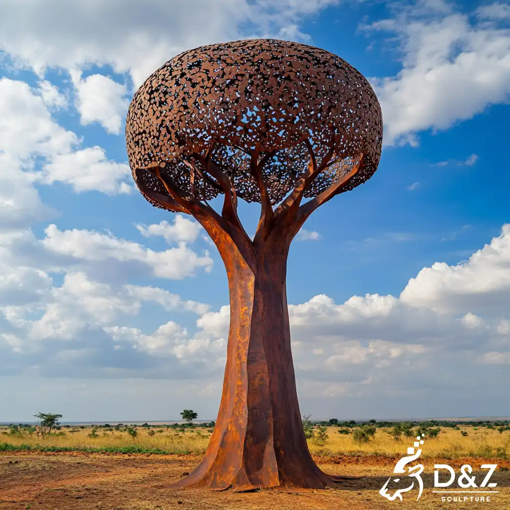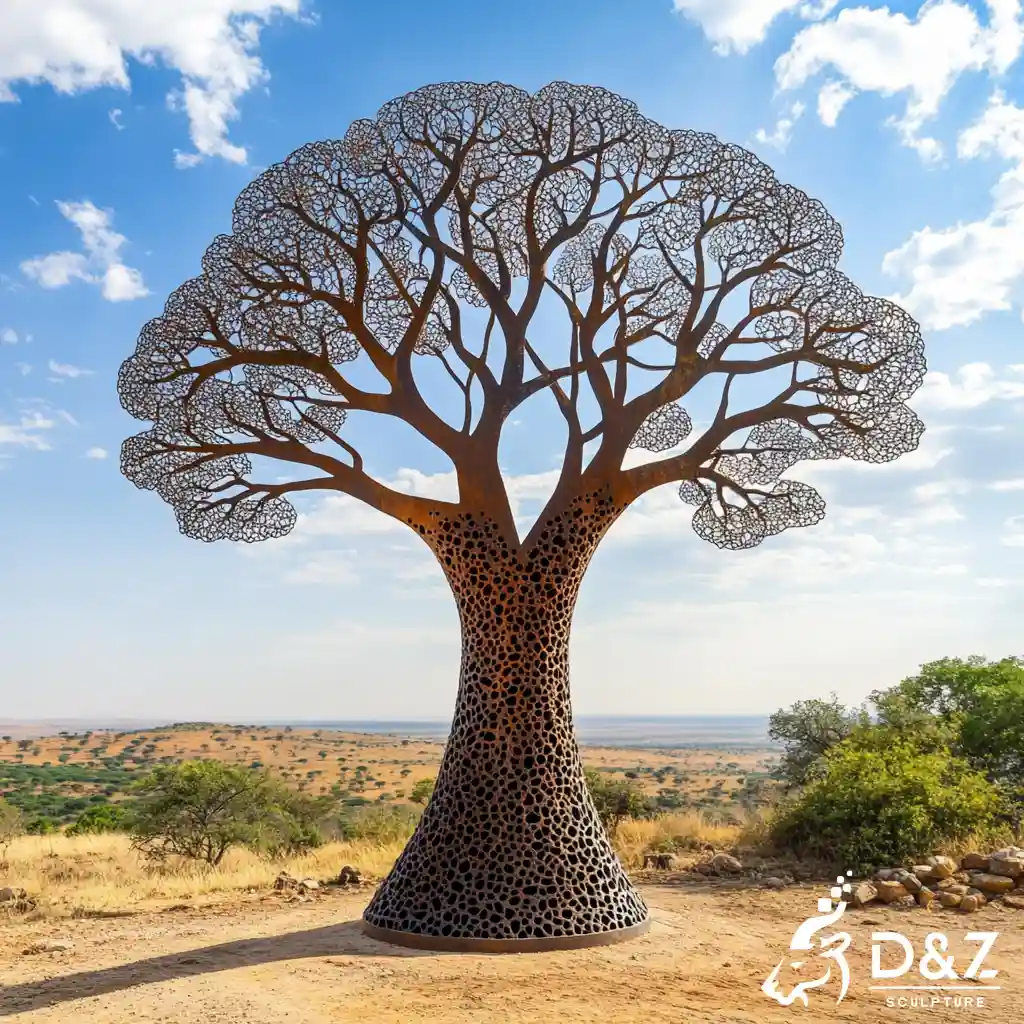 As a premier professional manufacturer, D&Z Art Sculpture presents the large modern African sculpture series, featuring our signature corten steel baobab tree. These towering baobab metal sculptures perfectly blend the iconic silhouette of the African “Tree of Life” with a contemporary industrial aesthetic. Engineered for durability and artistic impact, our baobab sculpture serves as a focal point for luxury estates, public plazas, and botanical gardens, offering a maintenance-free, weather-resistant solution for high-end outdoor decor.
