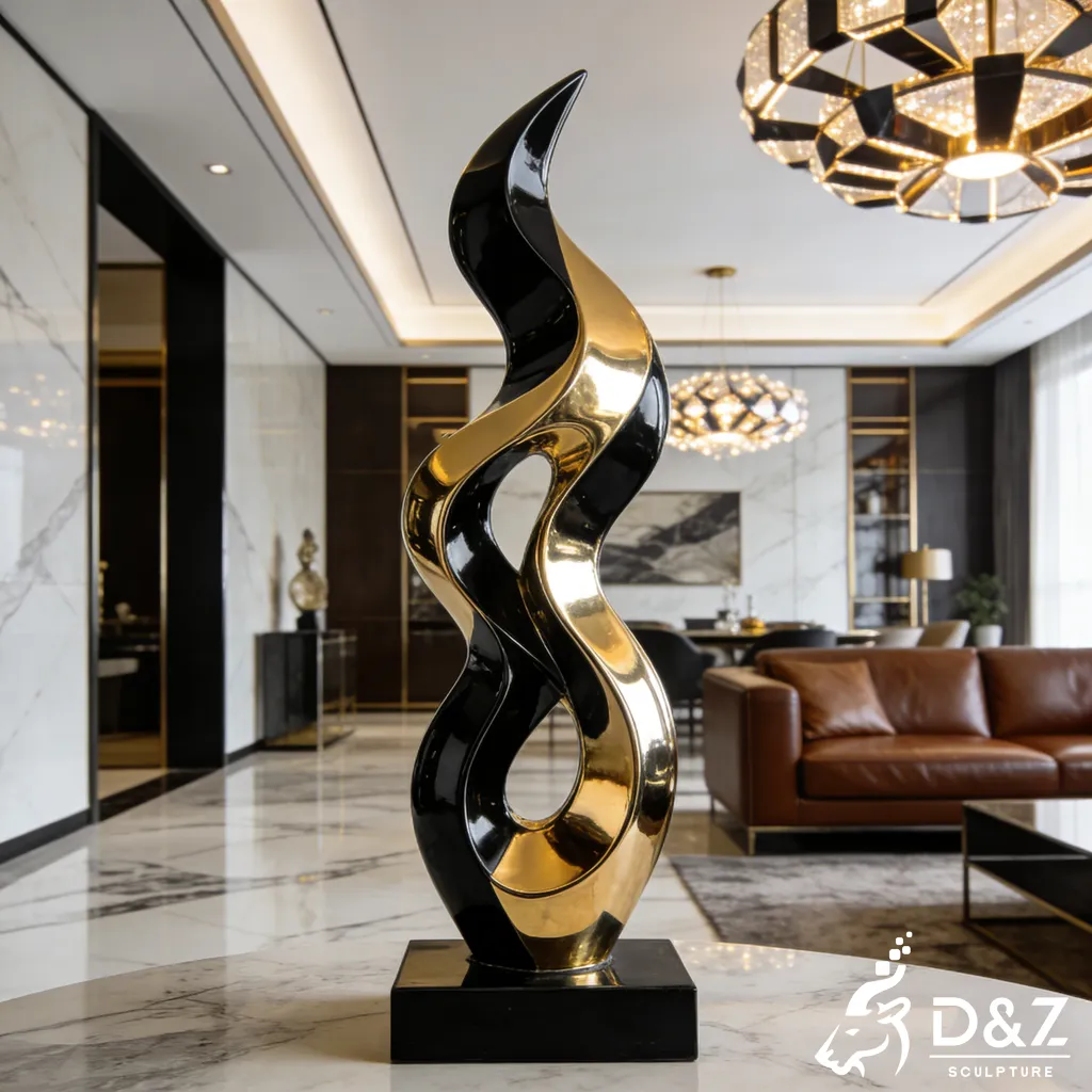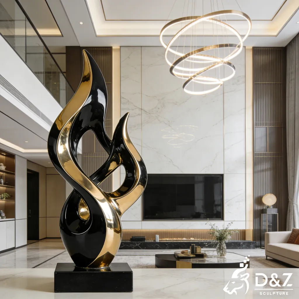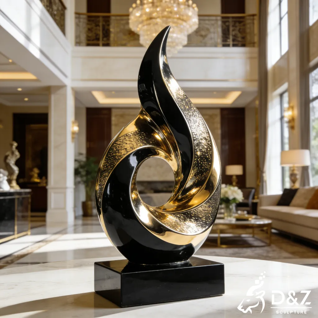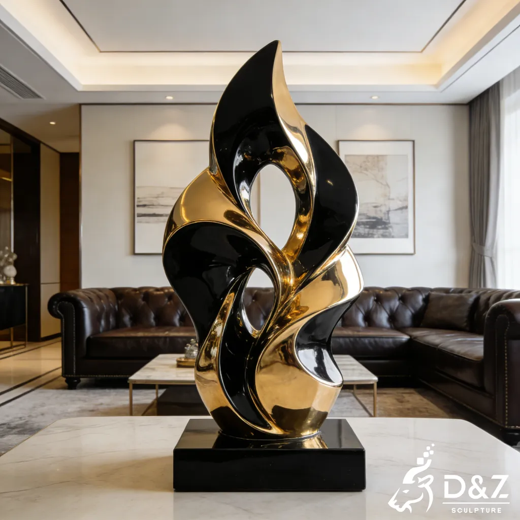 This collection of modern interior sculptures draws inspiration from the fluid motion of fire and the infinite nature of curves. The striking contrast between the deep “Piano Black” and the radiant “Mirror Gold” creates a visual rhythm that captures light from every angle. Beyond mere decoration, these pieces symbolize growth, prosperity, and the harmonious balance of elements. Whether you seek a focal point for a grand lobby or a minimalist accent for a penthouse, these modern home sculptures provide an unmatched aesthetic presence.