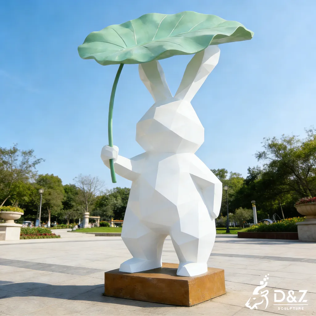 Modern public art is no longer just a static figure; it is a conversation between the viewer and the environment. This modern rabbit sculpture series reimagines the traditional garden bunny through a lens of digital-age aesthetics. By utilizing “low-poly” or geometric faceting, these sculptures of rabbits transform a familiar creature into a sophisticated architectural statement. Whether it’s a white rabbit sculpture holding a leaf or a pair of abstract rabbit sculptures interacting with a bird, these pieces serve as magnetic landmarks in any setting.