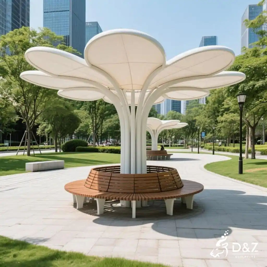 The metal petal canopy sculpture blends modern art with functional design. Its oversized petal structure provides both shade and seating, transforming public spaces into cultural landmarks. This flower-inspired installation brings beauty, comfort, and contemporary style to outdoor environments.