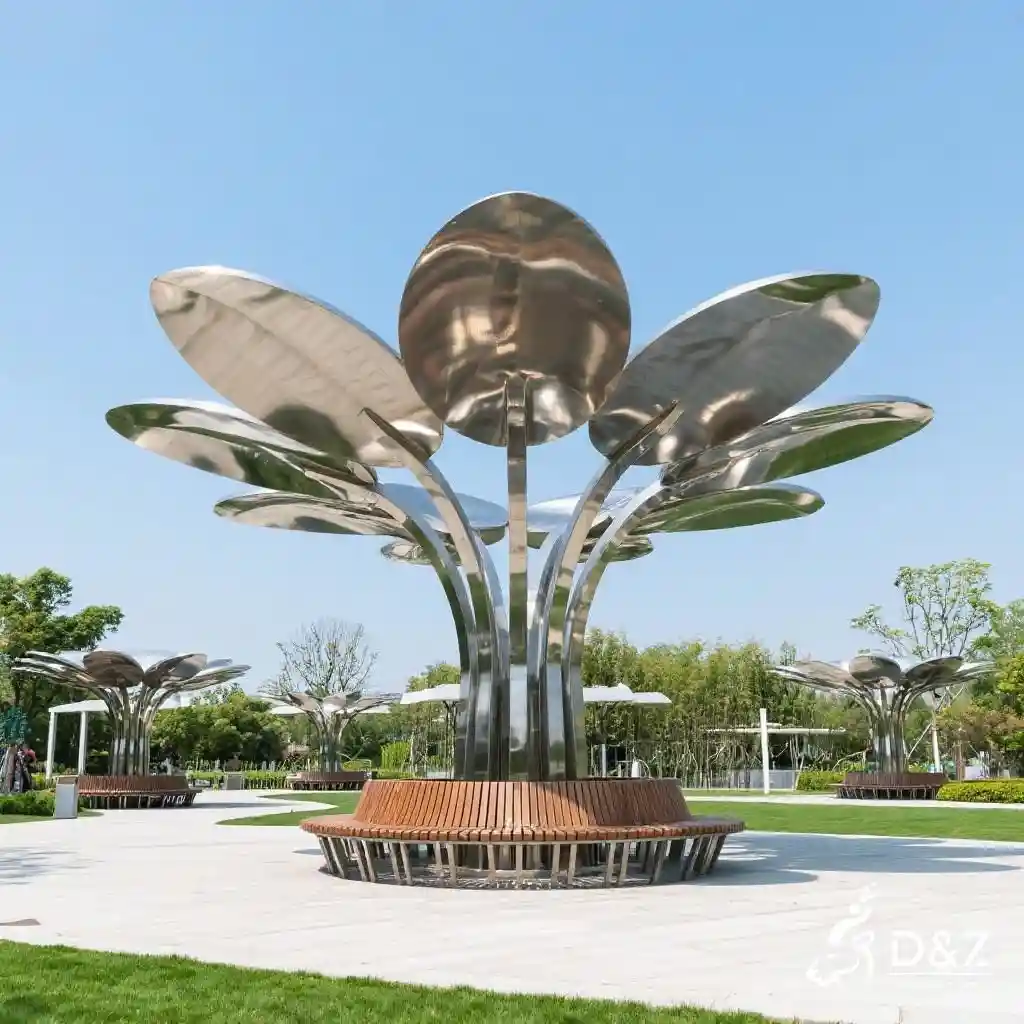 Crafted from premium stainless steel, the petal canopy offers durability and resistance to weather, rust, and UV exposure. Advanced metalworking techniques ensure smooth curves, vibrant finishes, and long-lasting performance. The polished surfaces highlight the structure’s fluid design while ensuring low maintenance.