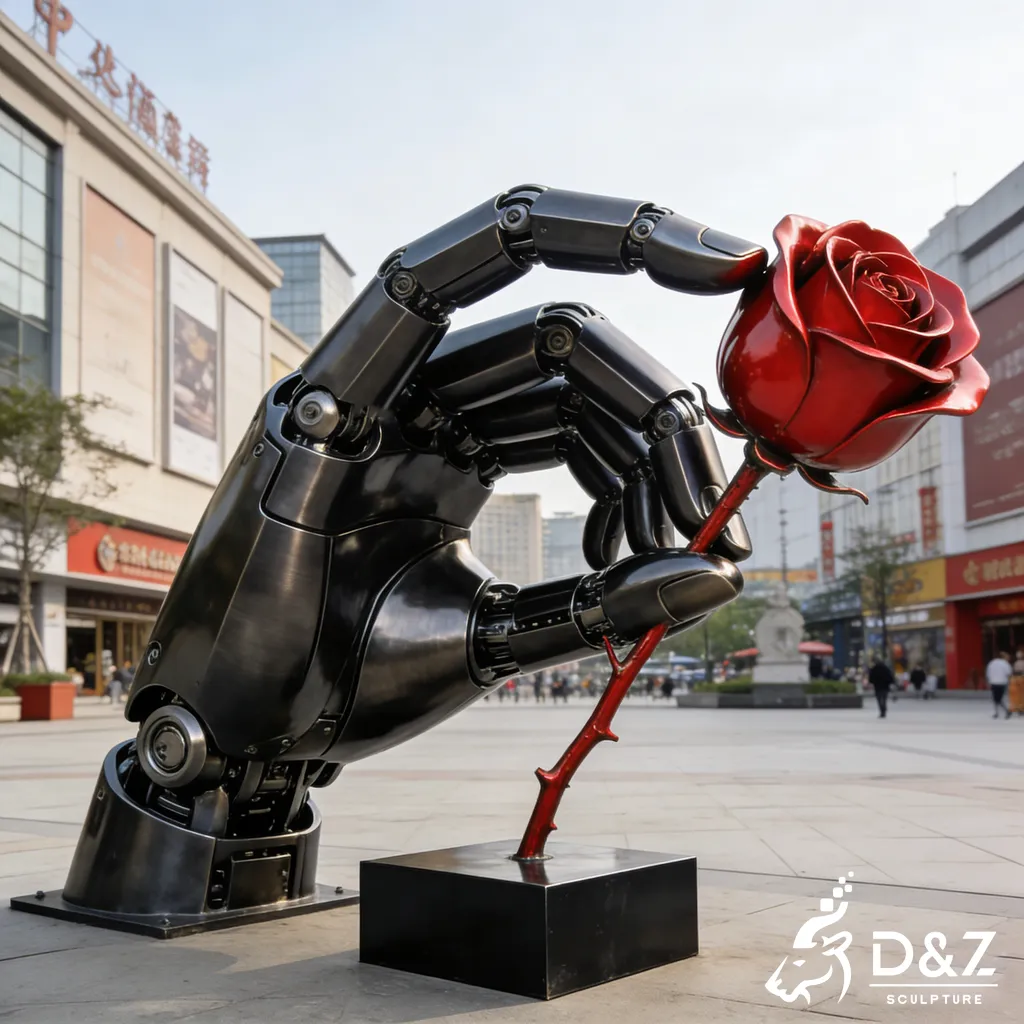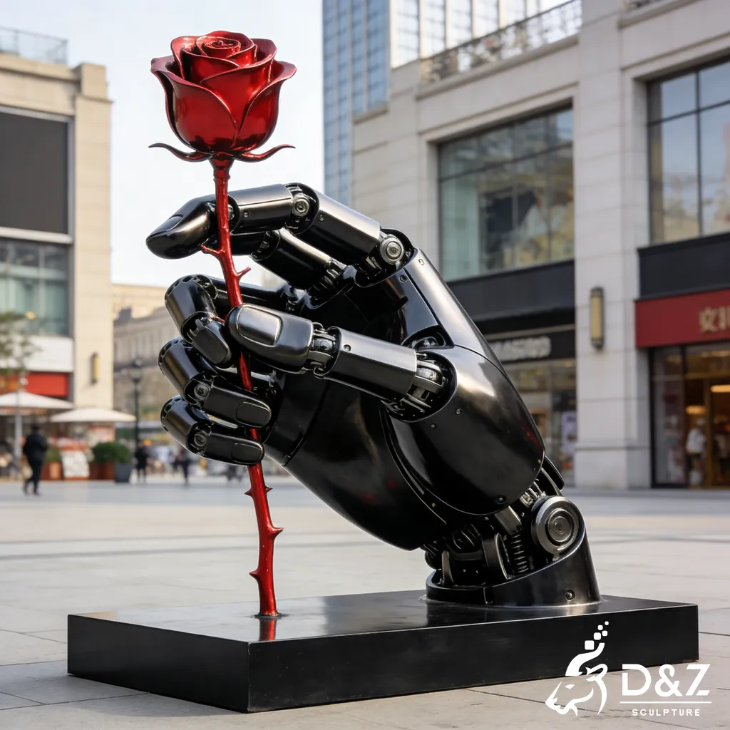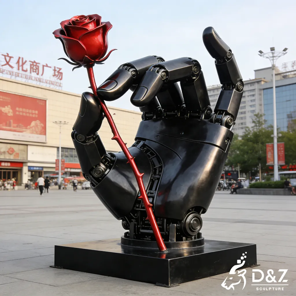 This robot hand sculpture blends futuristic design with artistic emotion, forming a striking hand with a rose sculpture that symbolizes the connection between technology and humanity. The bold black hand sculpture holding a delicate rose sculpture creates a strong visual contrast.
