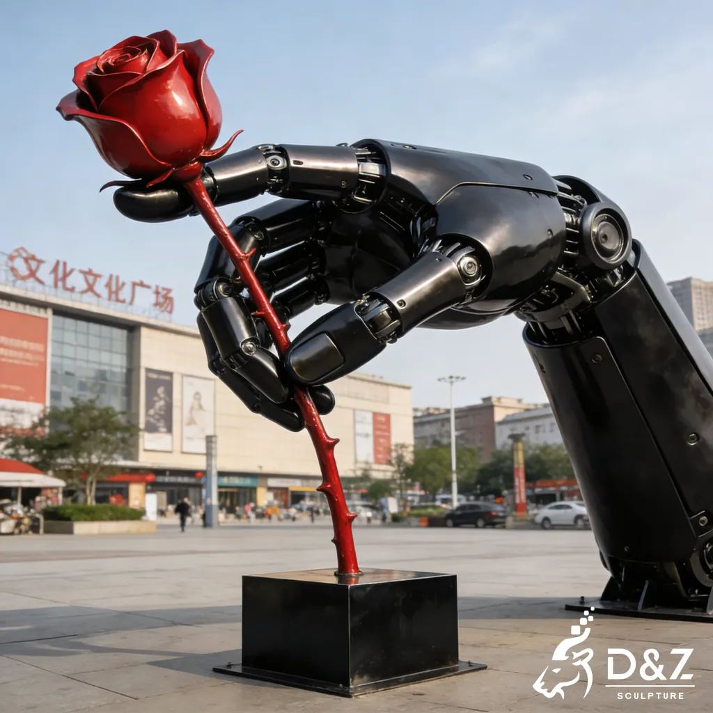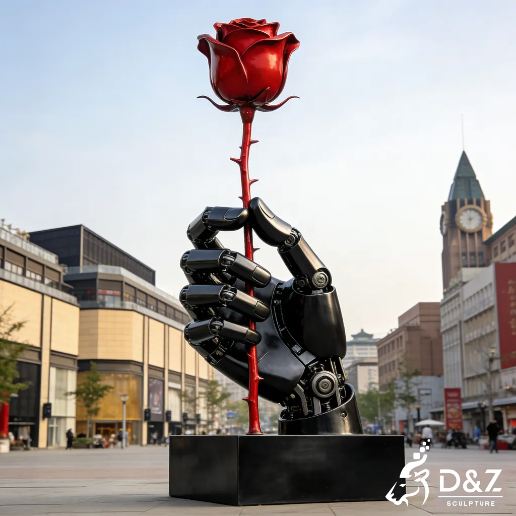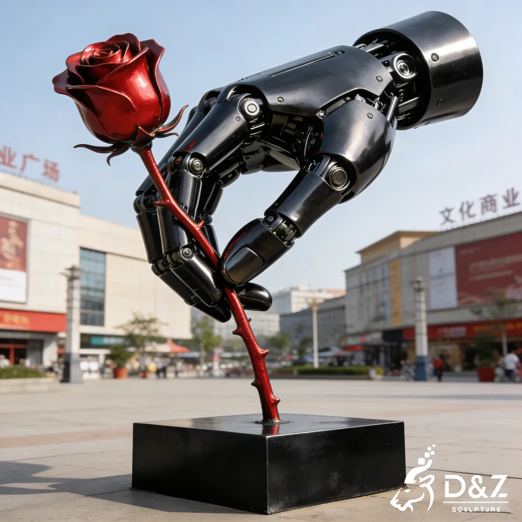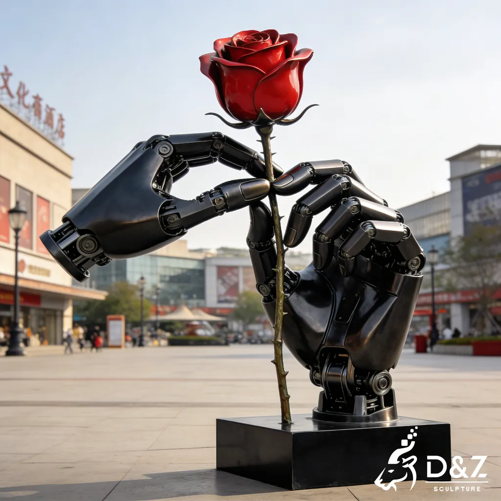 This robot hand sculpture blends futuristic design with artistic emotion, forming a striking hand with a rose sculpture that symbolizes the connection between technology and humanity. The bold black hand sculpture holding a delicate rose sculpture creates a strong visual contrast.