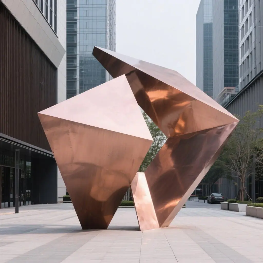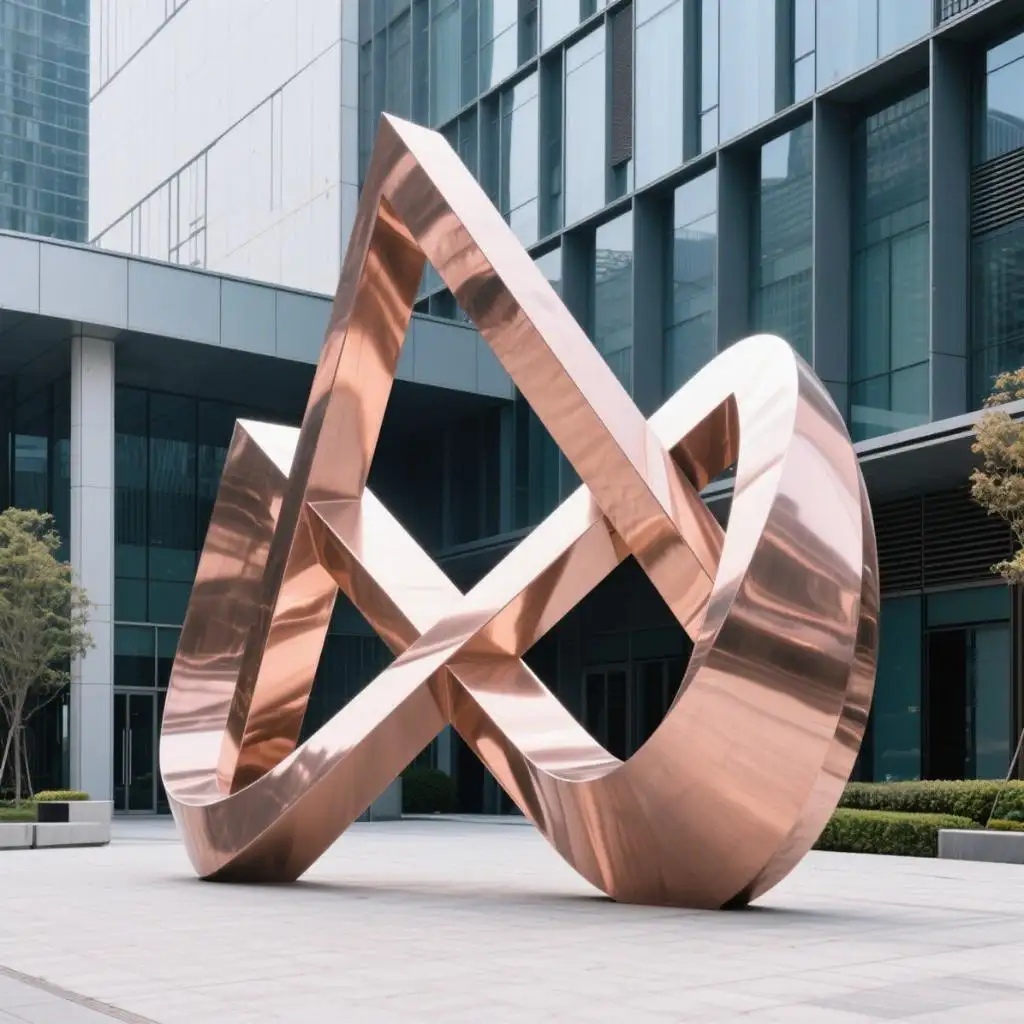The intersecting forms speak to balance and transformation, evoking themes of unity, strength, and motion. As a piece of abstract modern rose gold sculpture, it invites interpretation, making it an engaging focal point for passersby and an icon of visionary space design. This unique sculpture is more than just visually stunning—it represents the dynamic pulse of modern architecture and urban life.