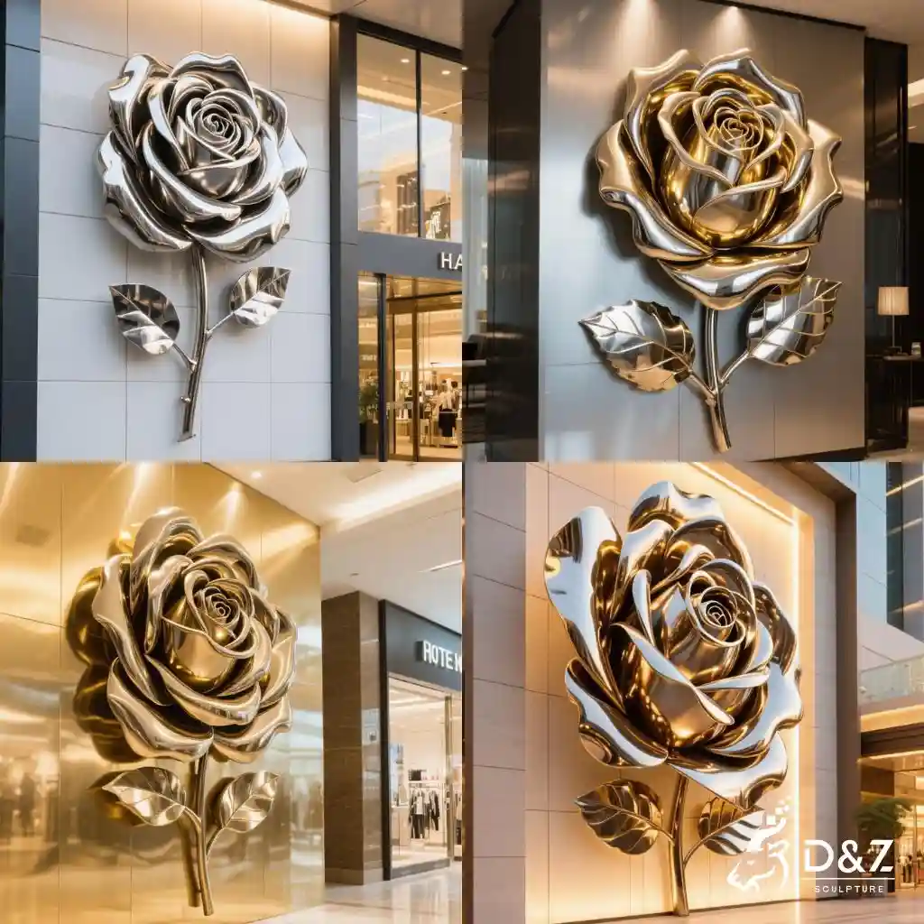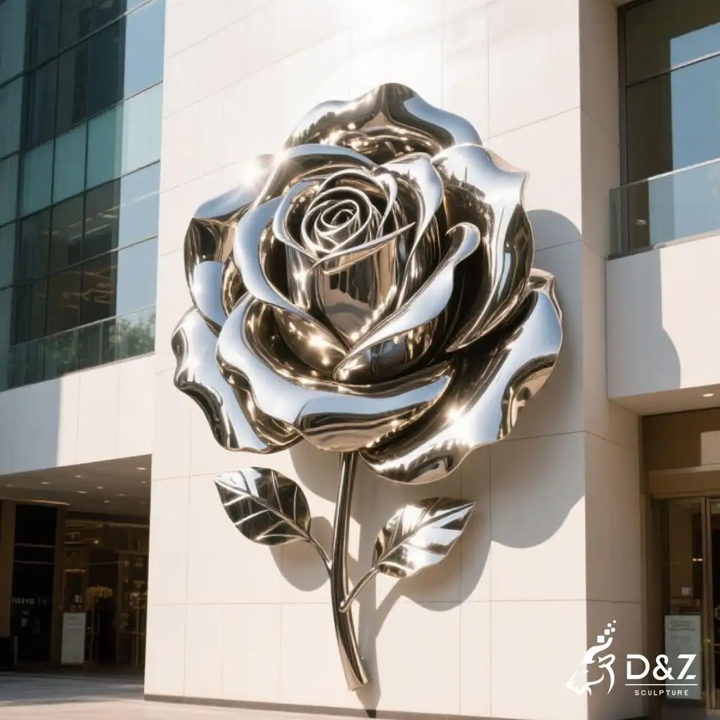 The design symbolizes love, passion, and strength. The reflective stainless steel surface interacts with ambient lighting, producing subtle color shifts throughout the day. Available in rose gold, silver, or custom colors, the rose wall sculpture offers a luxurious focal point that integrates seamlessly with various architectural styles.