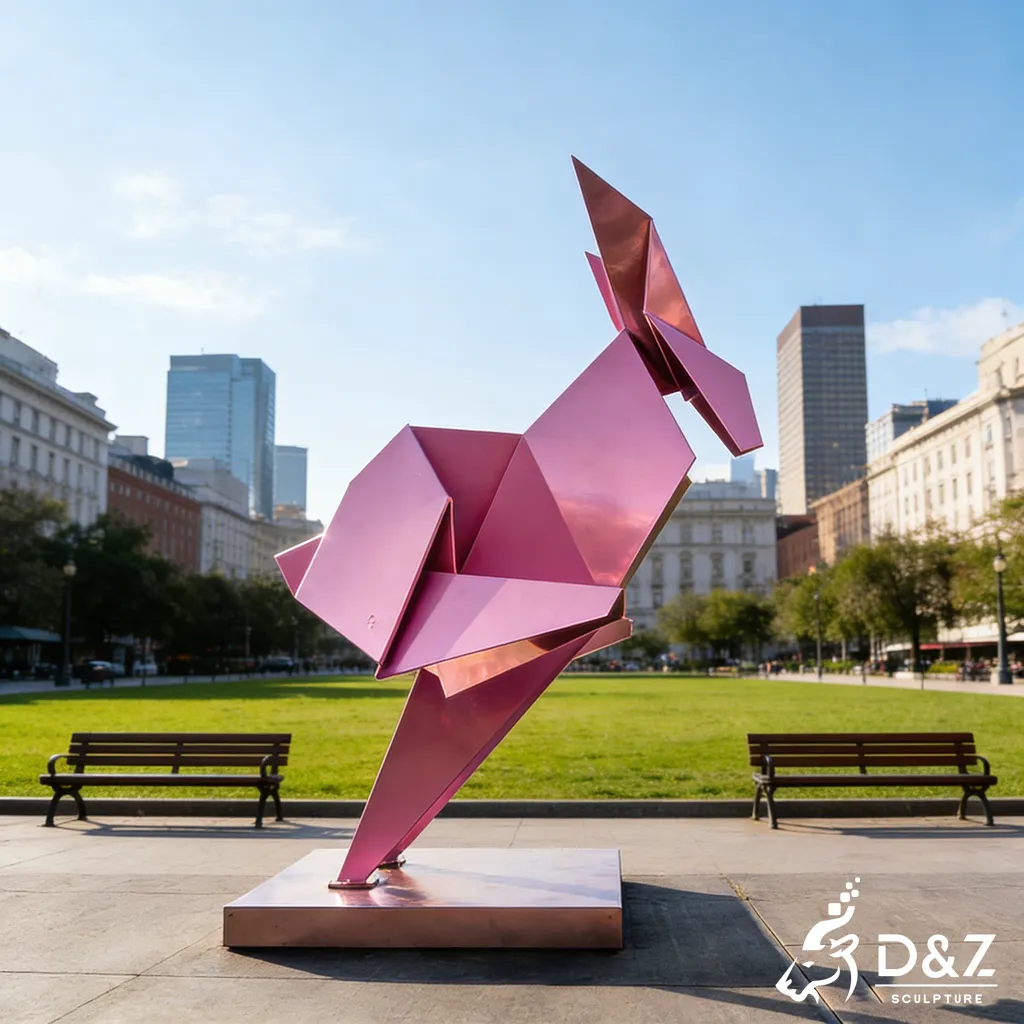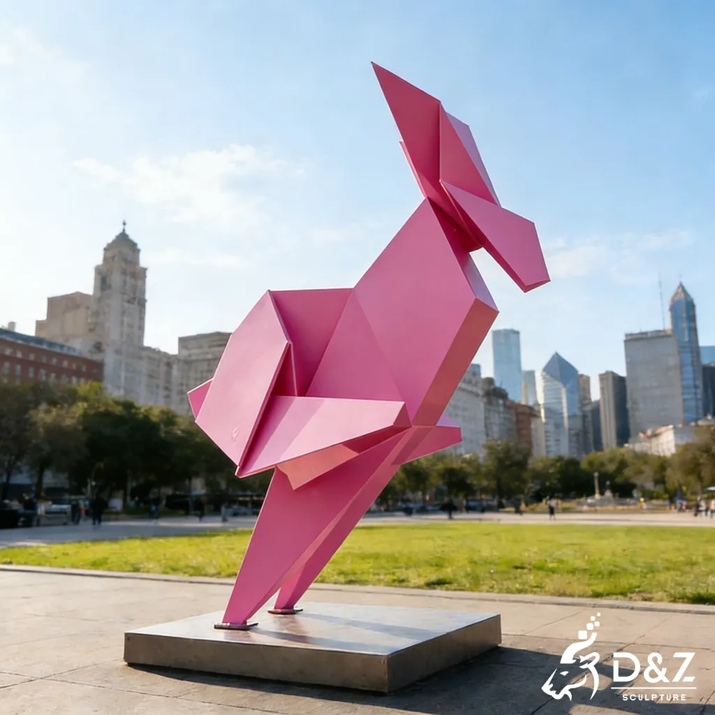 Elevate any outdoor or indoor setting with this eye-catching running rabbit garden sculpture from D&Z Art Sculpture. Crafted in vibrant pink metal with bold geometric origami folds, this giant rabbit sculpture brings playful energy, modern elegance, and artistic sophistication to gardens, parks, plazas, and contemporary interiors.