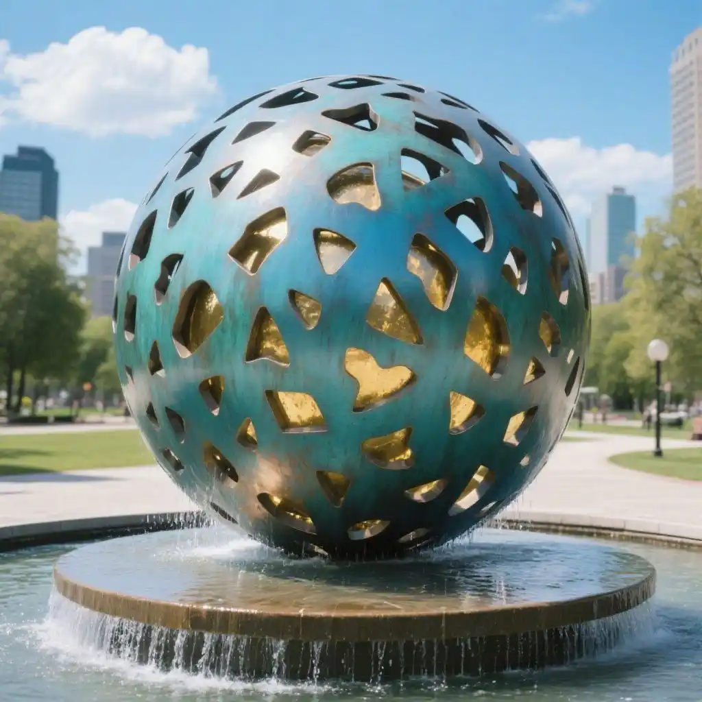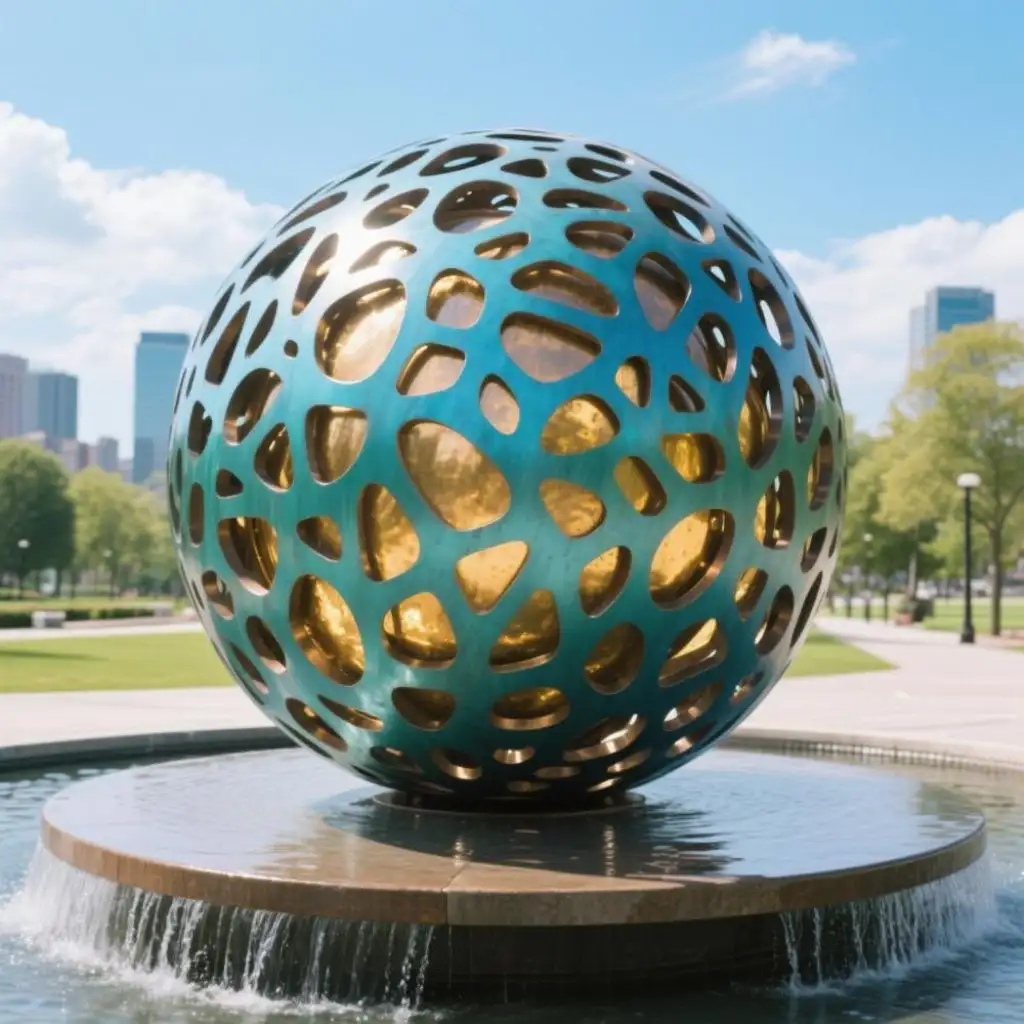The sphere water fountain features a large, hollow sphere with organically shaped cutouts. These irregular openings form a patterned skin, inspired by cellular networks and nature’s flowing forms. The design balances symmetry and chaos, giving the sculpture both structure and visual energy.