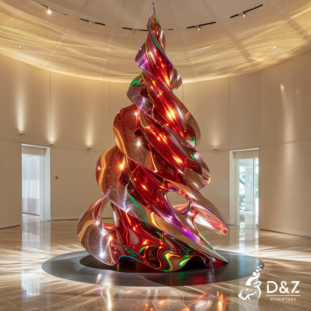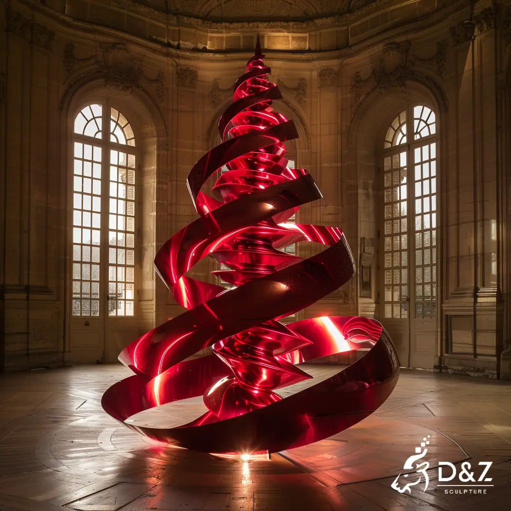 D&Z Art Sculpture offers standard sizes (e.g., 2m/6.5ft, 3m/9.8ft) to fit different spaces. Custom heights are available, too. The wide, weighted metal base keeps this spiral Christmas tree steady. Its layered, twisting form mimics a spiral ribbon Christmas tree, with open spaces that let light pass through for dynamic visual effects.