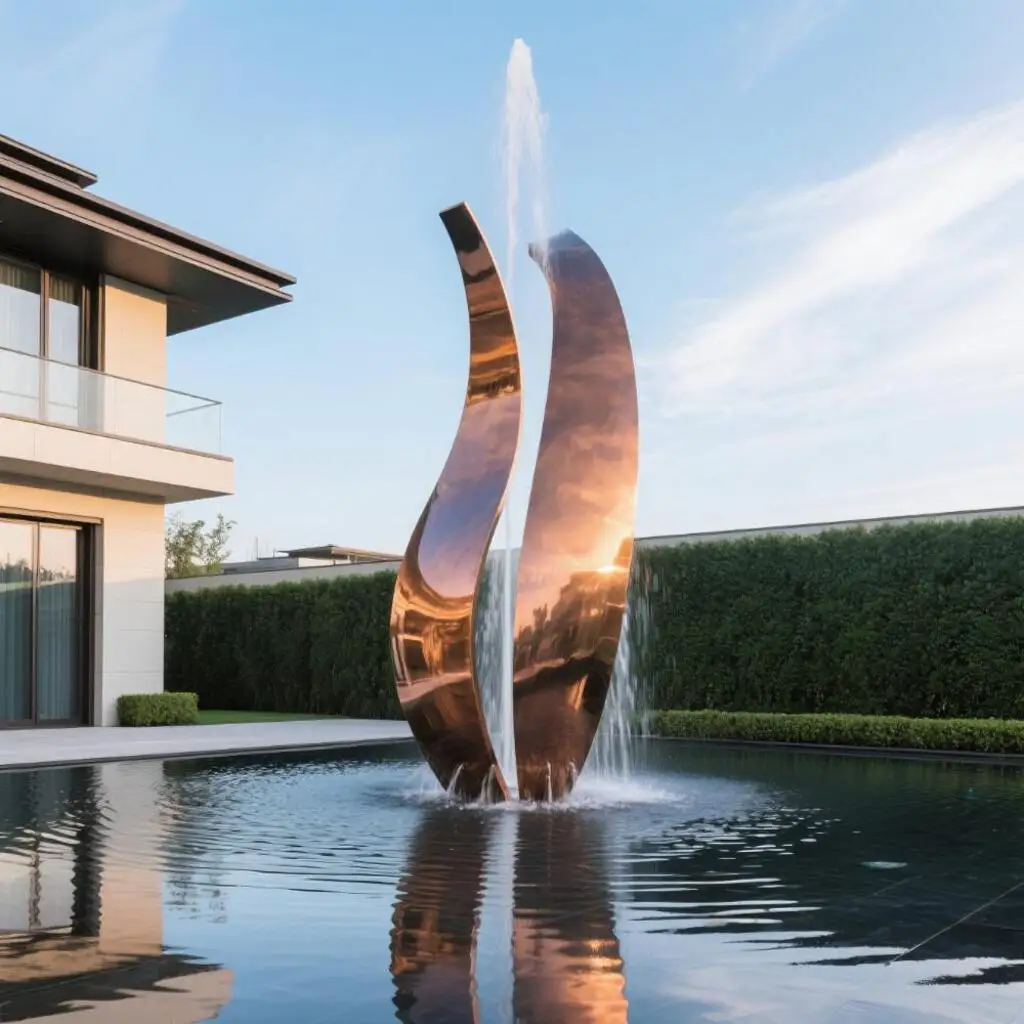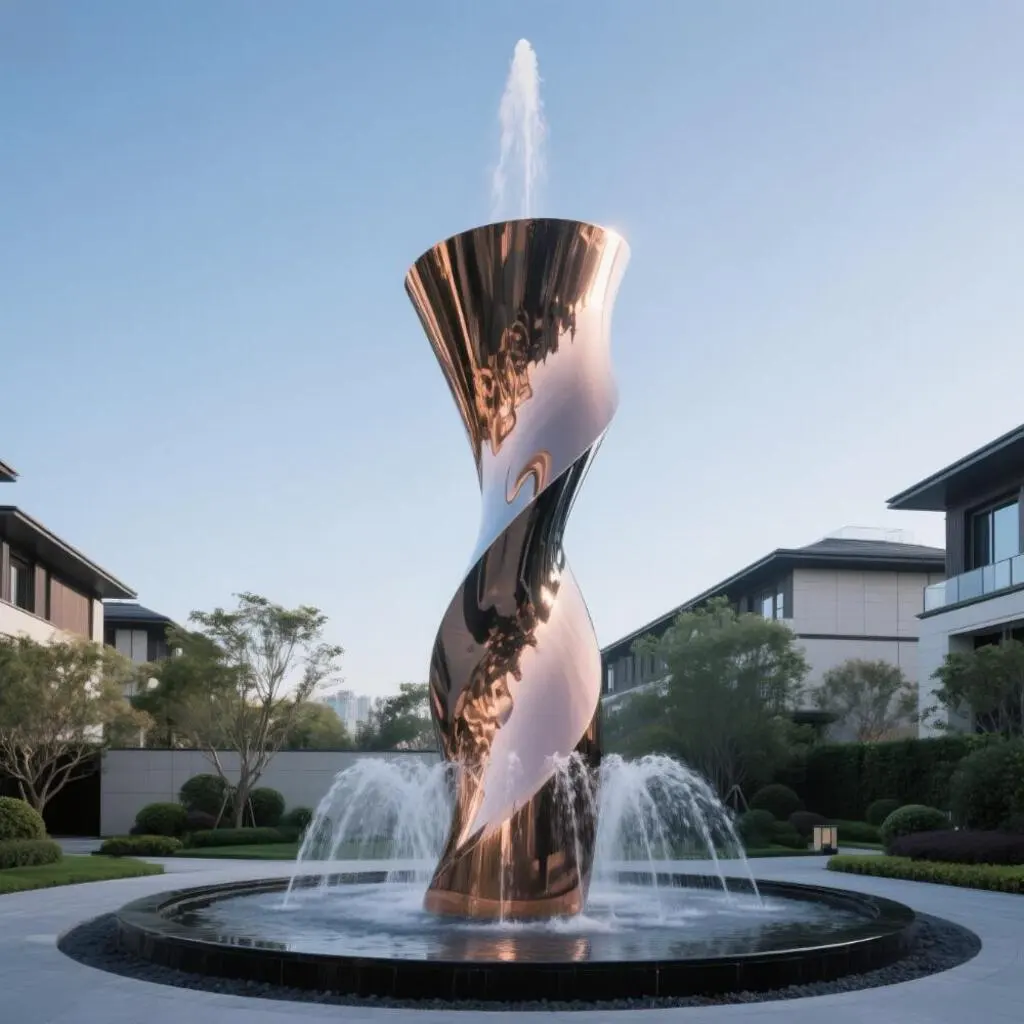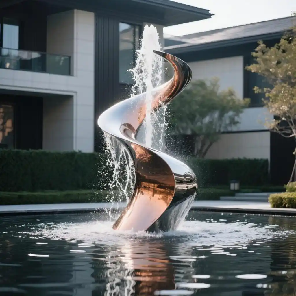 Its hyperbolic spiral form represents mathematical beauty translated into metal art. The combination of double curves and water flow gives this sculpture a futuristic yet organic feel. Even when not in motion, it remains visually captivating through the elegance of its contours and surface reflections.