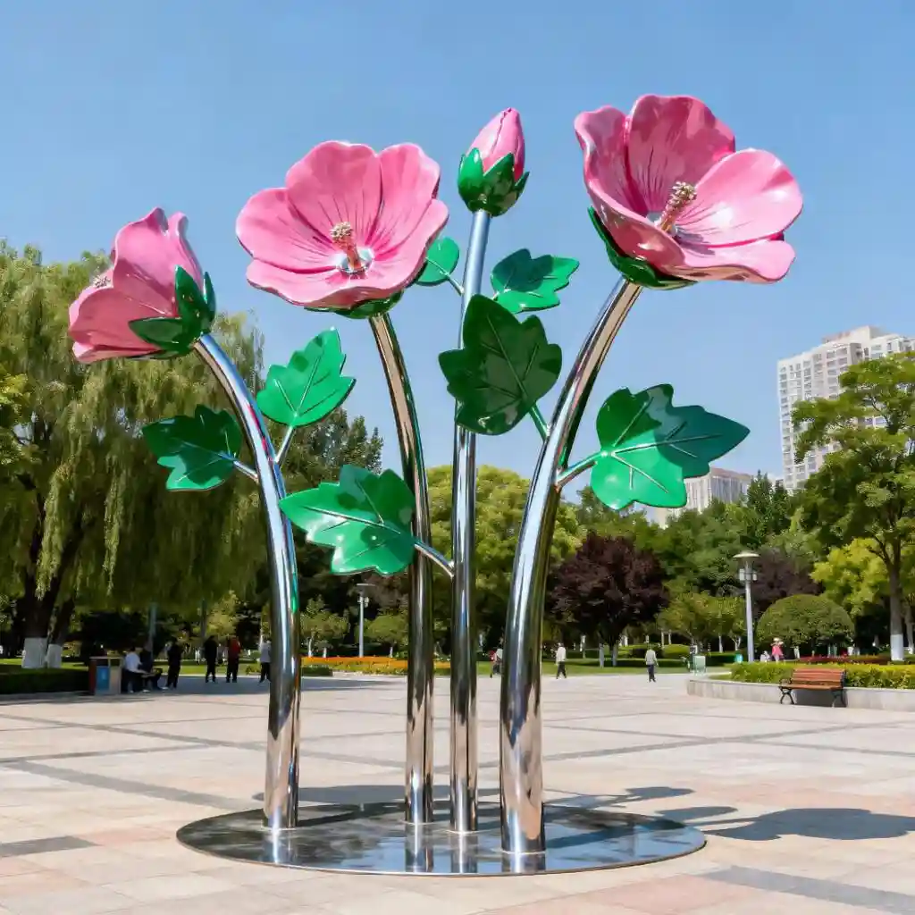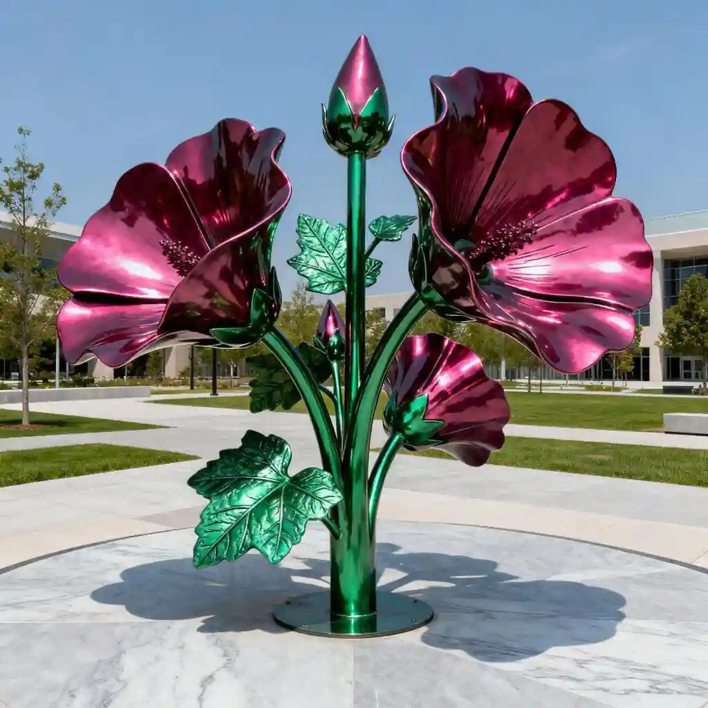 The stainless steel flower sculpture draws inspiration from the delicate and charming mallow flower. Each sculpture showcases the intricate details of mallow blooms – from the soft curves of the petals to the lifelike texture of the leaves – all rendered in stainless steel. Available in various sizes, from tabletop accents to large mallow stainless steel flower sculptures that become the centerpiece of a garden or plaza, they bring a touch of botanical beauty that lasts.