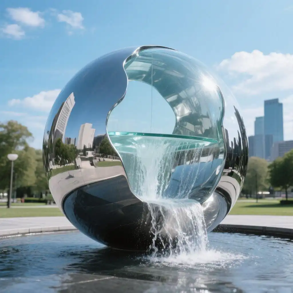 At the heart of the design is a half-glass, half-metal sphere. The lower half, made of mirror-polished stainless steel, reflects the surroundings with clarity—sky, buildings, nature, and people become part of the sculpture. The upper half features a domed glass shell, offering a soft contrast to the metallic base. Together, they form a complete globe that feels futuristic yet balanced. Water flows gracefully from openings along the upper edge, creating soft arcs that catch the light and dance over the curved surface. These gentle streams bring movement and rhythm to the sculpture while enhancing its tranquil presence.