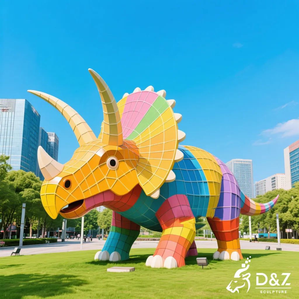 This Triceratops sculpture is a large-scale custom outdoor dinosaur artwork designed for theme parks, commercial plazas, and public landscapes. Crafted from premium metal, this large metal dinosaur sculpture combines artistic creativity with structural durability, making it ideal for Jurassic Park sculptures, dinosaur playground projects, and city landmark installations.