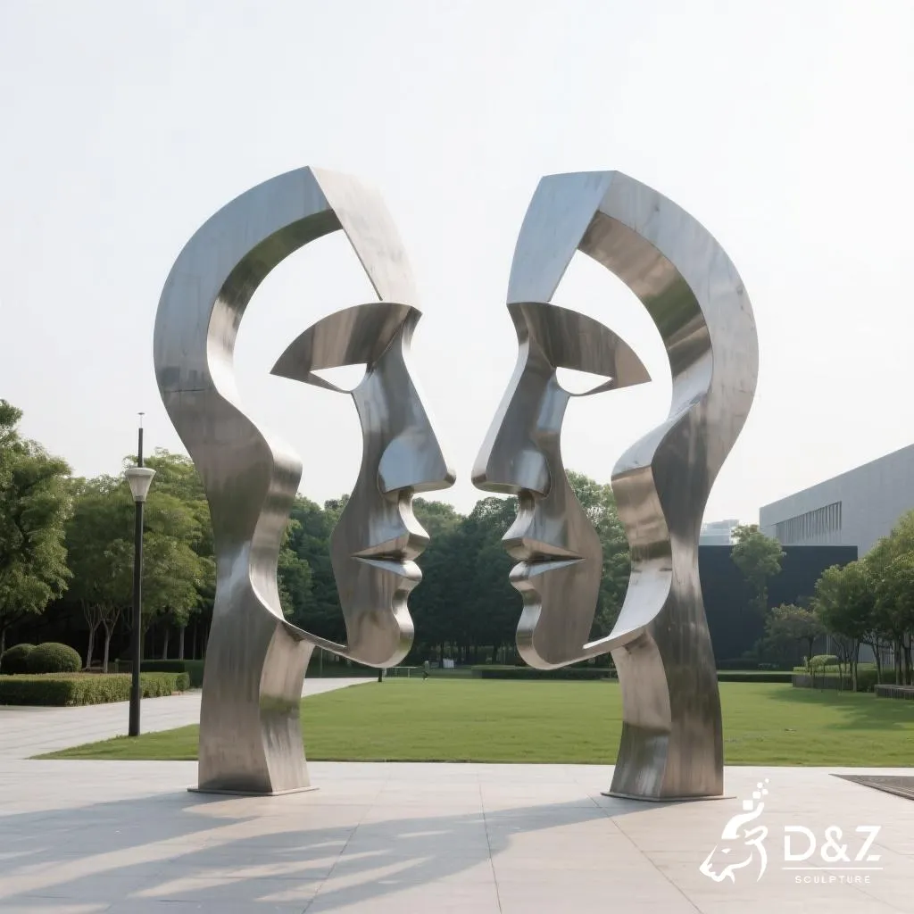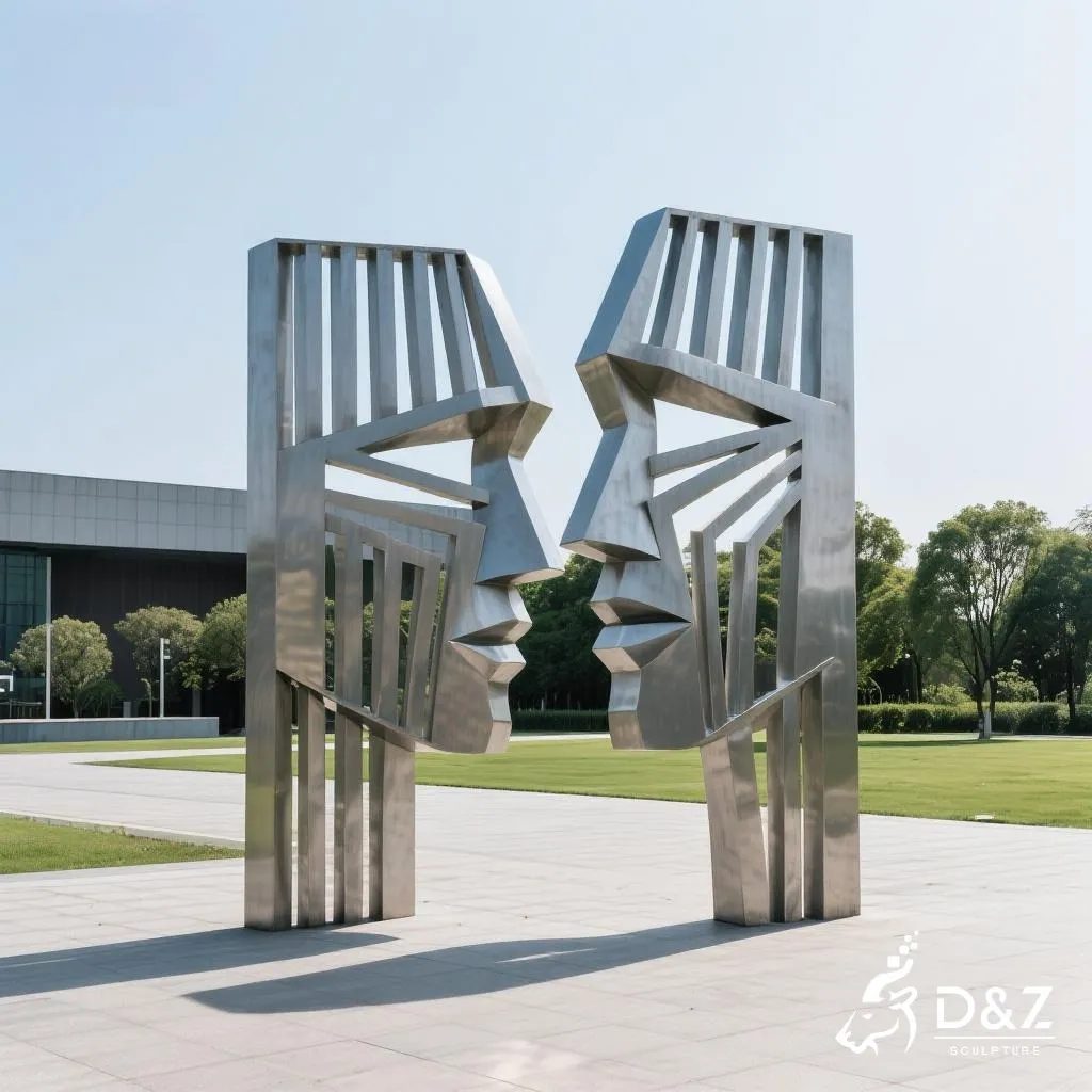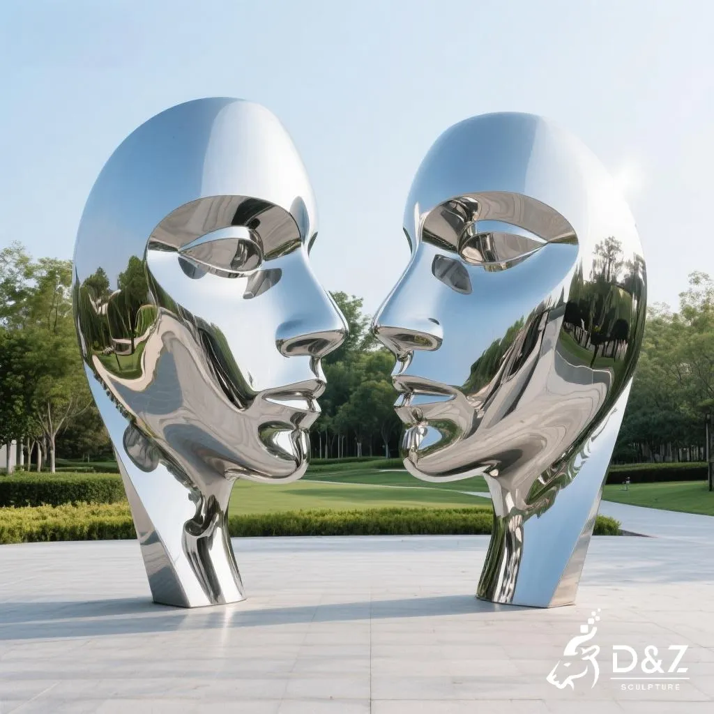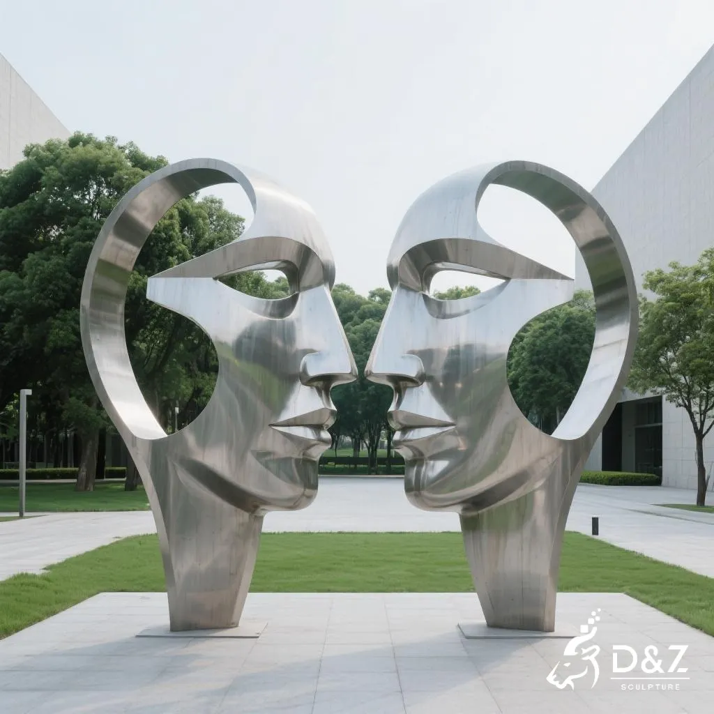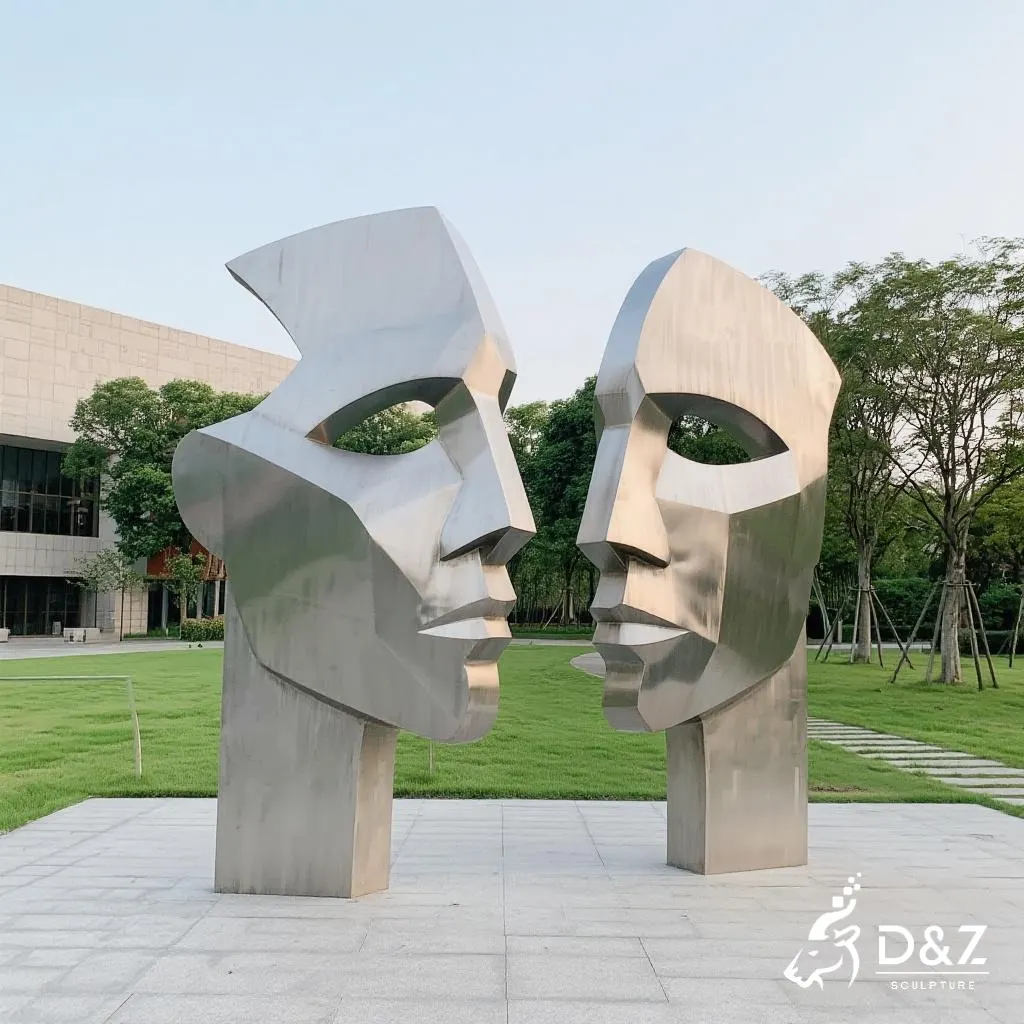 The design features two abstract human faces connected as one, facing opposite directions. Each geometric surface reflects light differently, creating fascinating shadow effects throughout the day. This geometric face sculpture symbolizes human emotion and thought – two sides in harmony and contrast. It fits perfectly into modern art gardens, sculpture parks, or architectural landscapes.