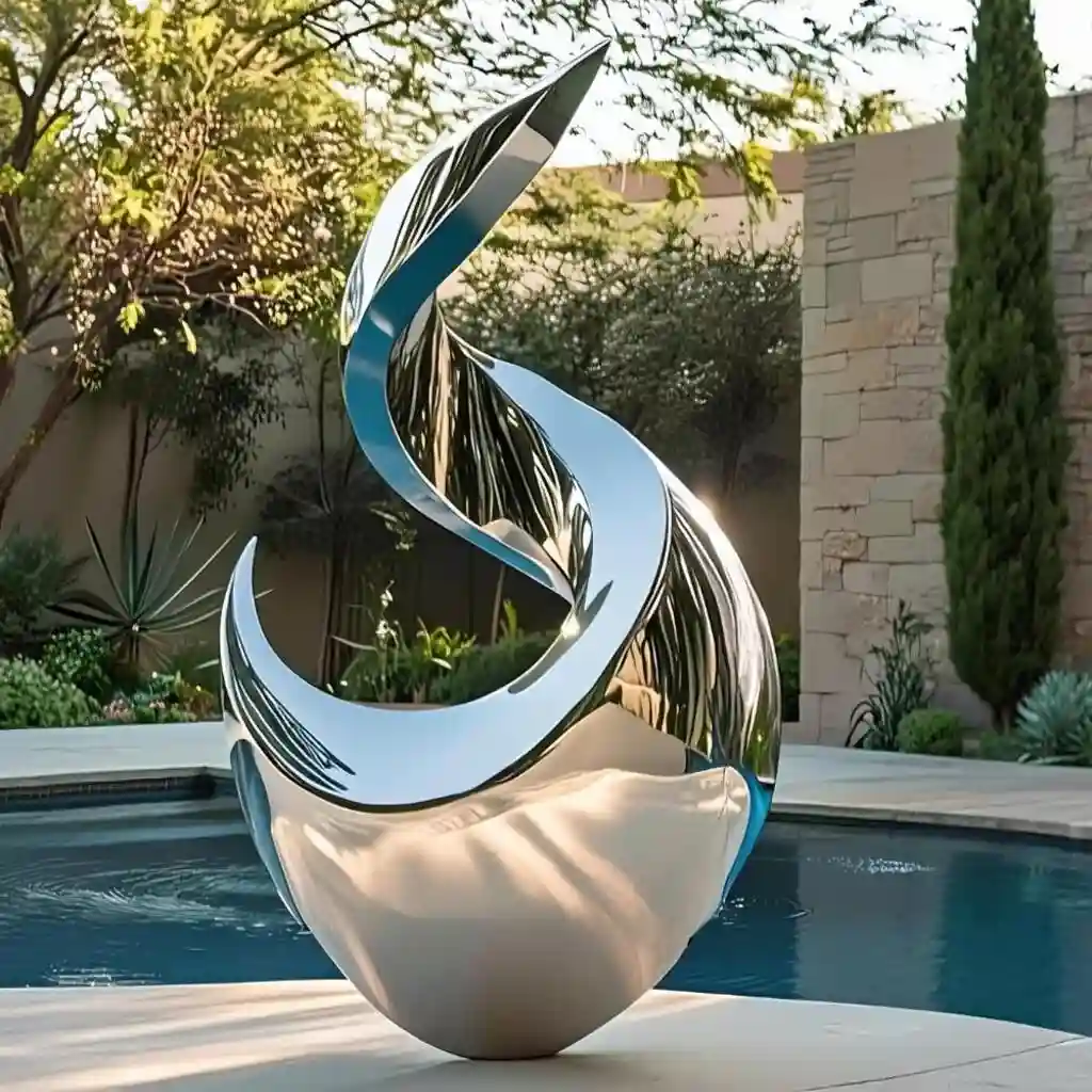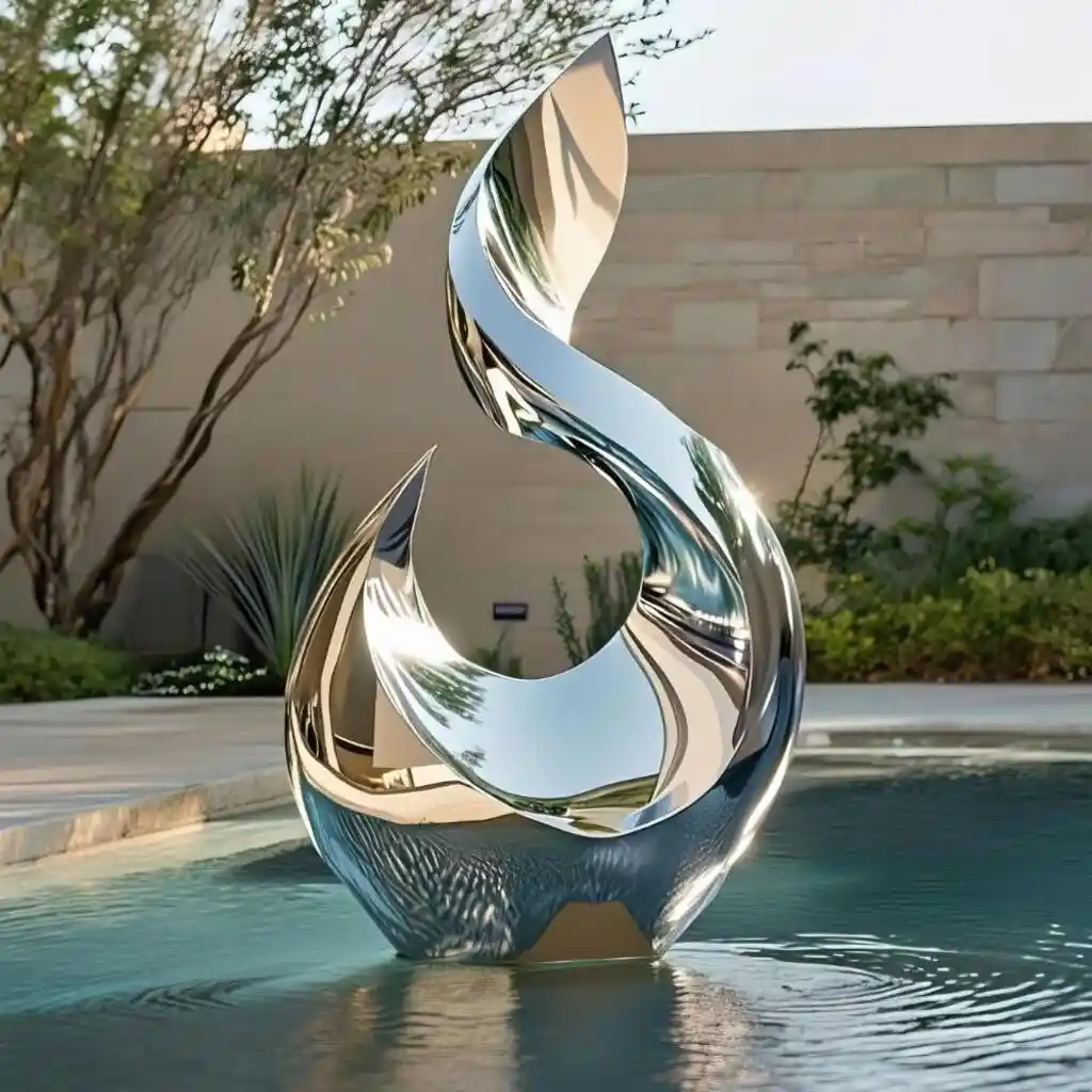 The modern abstract metal flame water feature sculpture merges contemporary design with elemental symbolism. Crafted from premium stainless steel and mirror-polished to a reflective sheen, this sculpture creates an ever-changing play of light and surroundings. The flame-like form evokes motion, energy, and balance, making it more than decor-it becomes a central focal point of modern outdoor art.