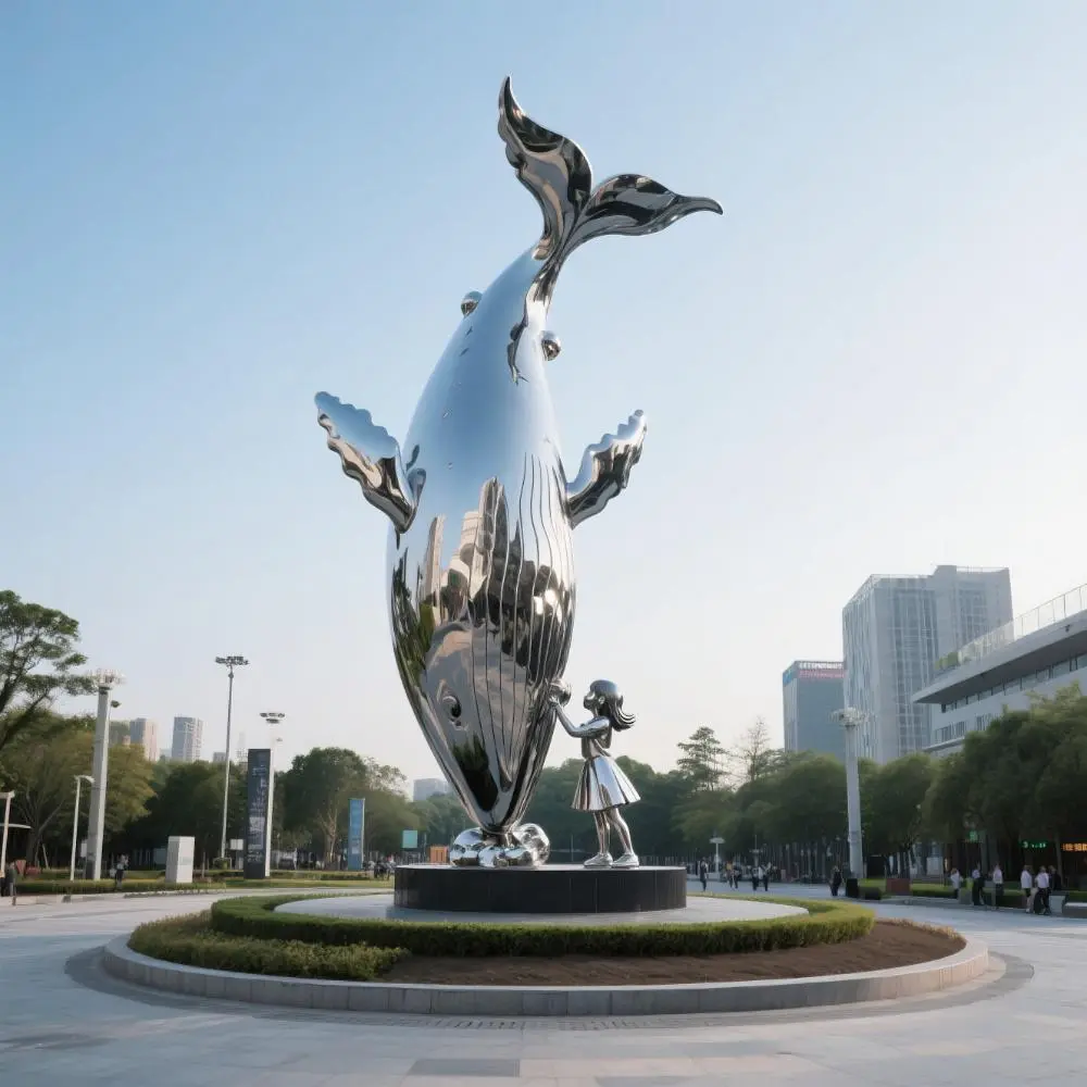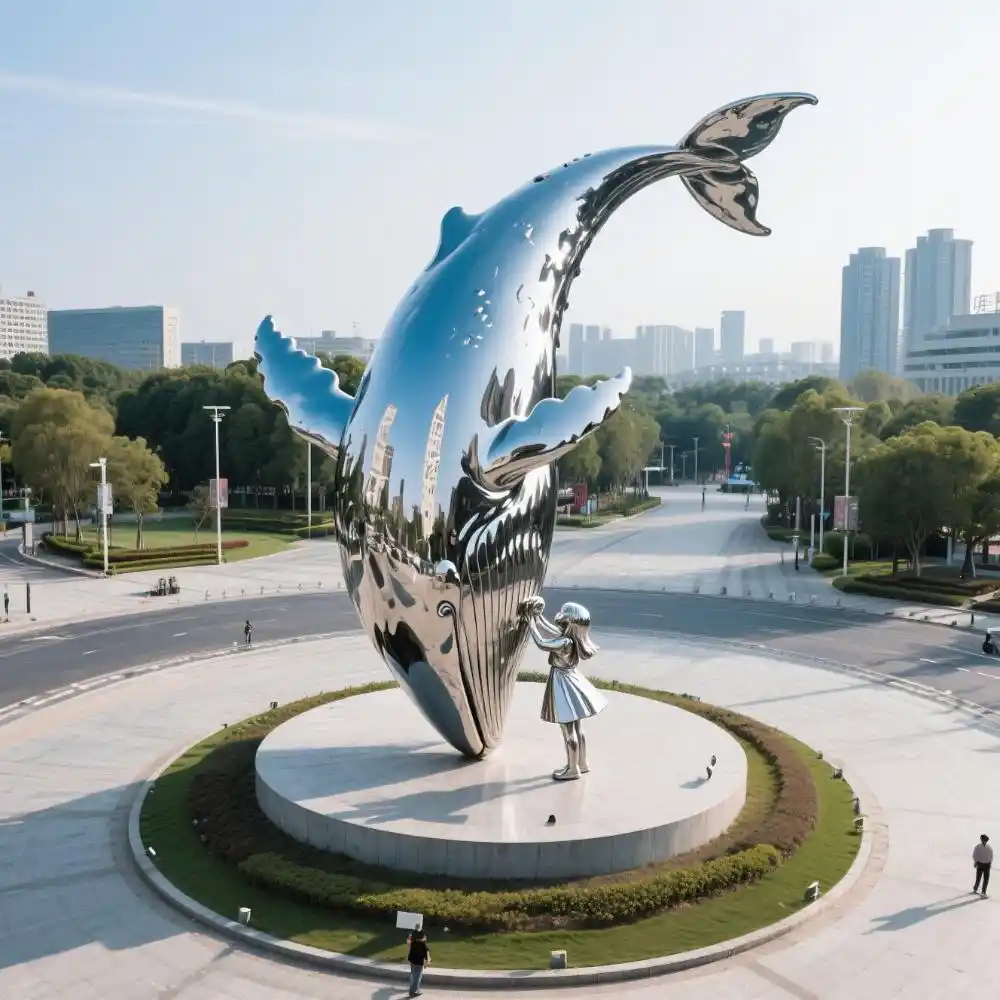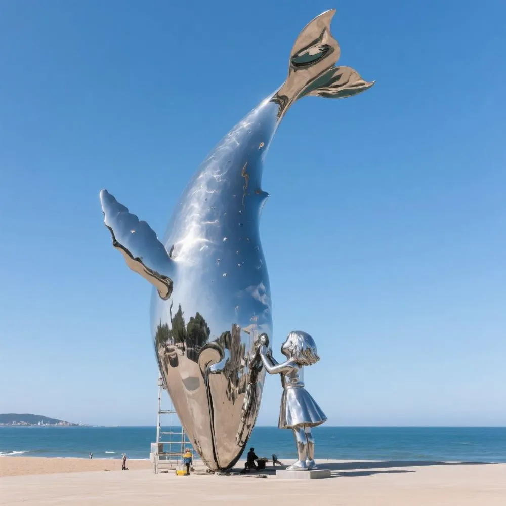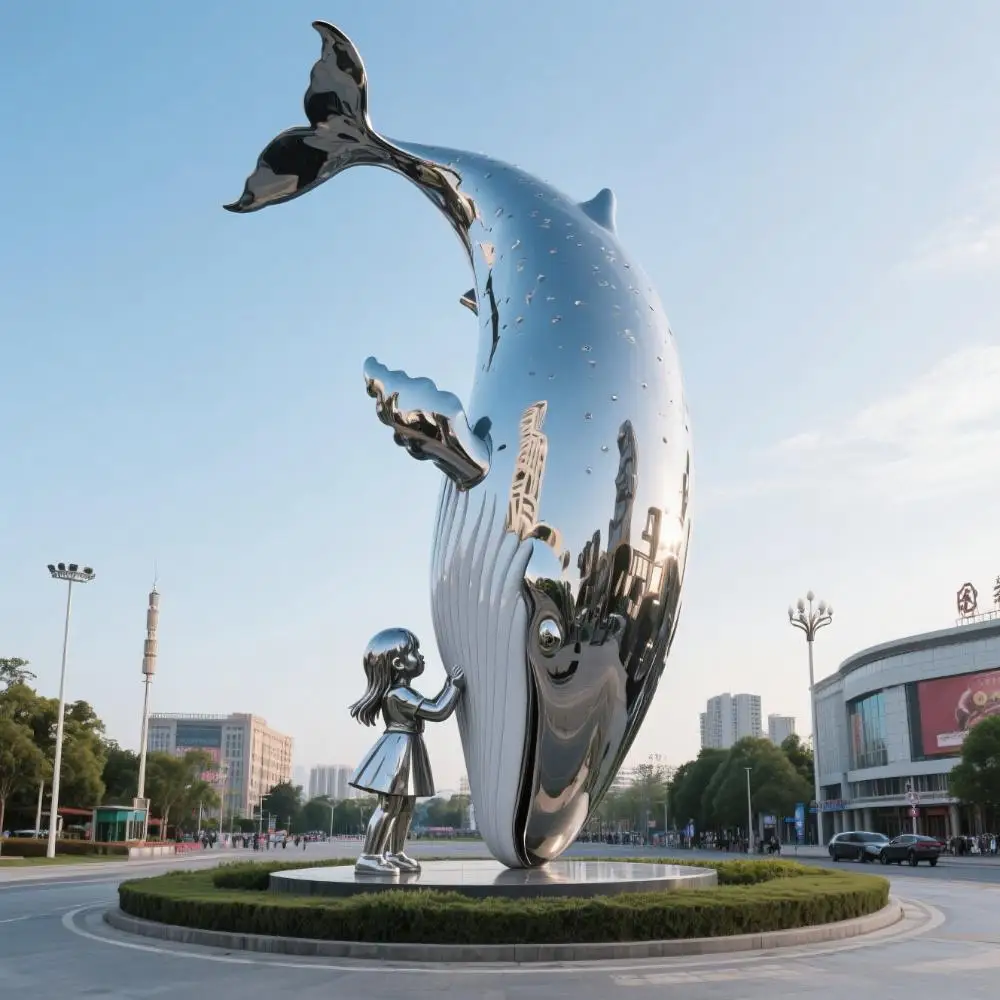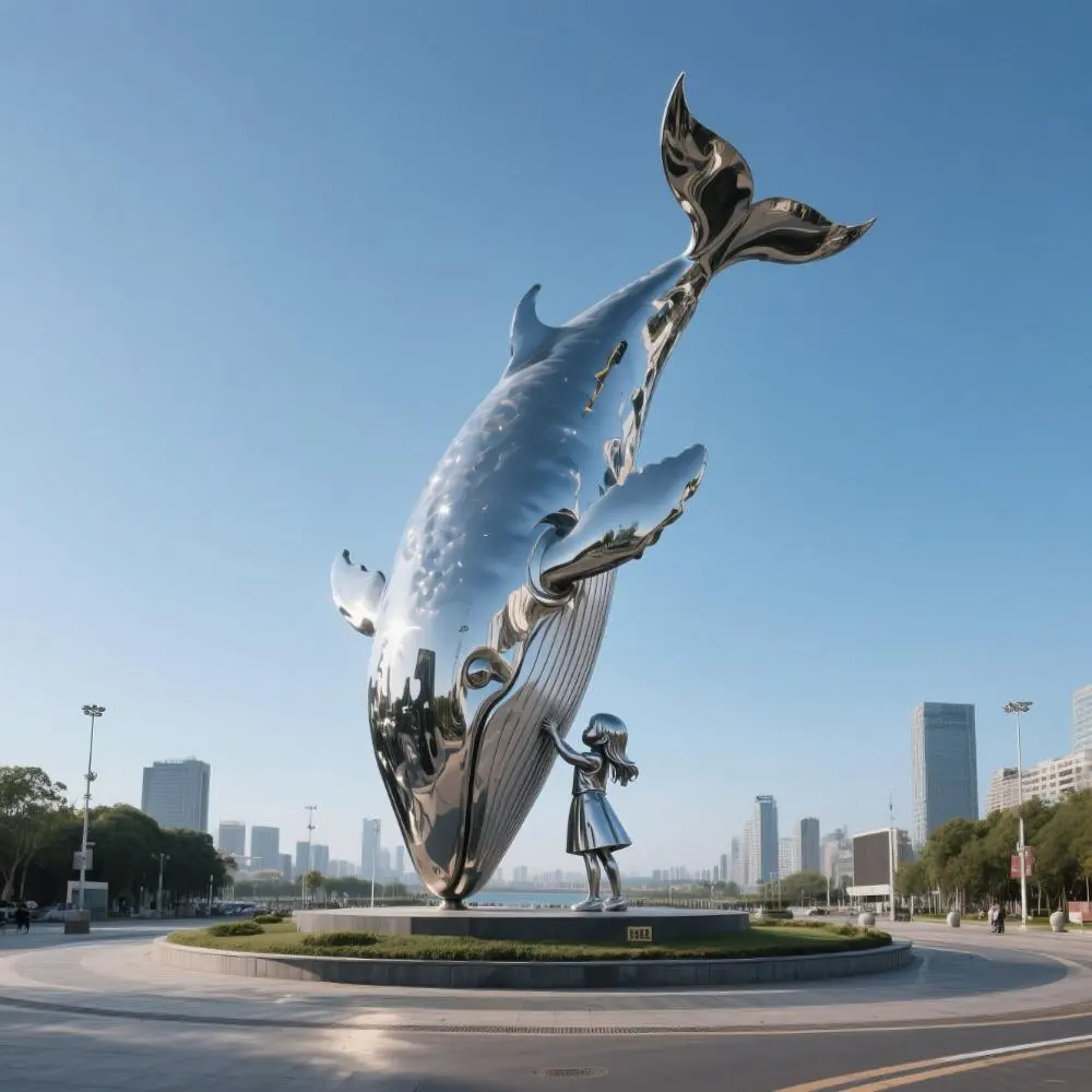 This whale sculpture captures a breathtaking moment between a young girl and a massive whale. The whale rises vertically, defying gravity, its mirror-polished body gleaming under city lights. The girl stands calmly, arm extended, touching the giant creature with a sense of awe. This large metal sculpture combines surreal imagination with the grace of marine life. It brings a sense of magic to any public space.