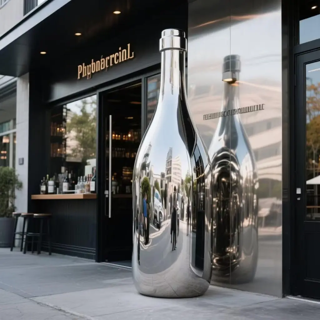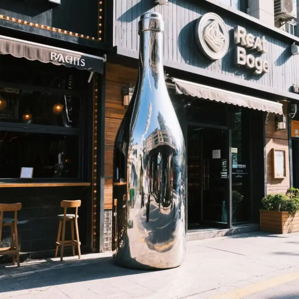 Made from premium stainless steel, this wine bottle sculpture stands strong in any weather. The mirror-polished surface not only adds a luxurious glow but also resists corrosion and wear. It’s a perfect example of a custom stainless steel outdoor sculpture that balances style with durability.