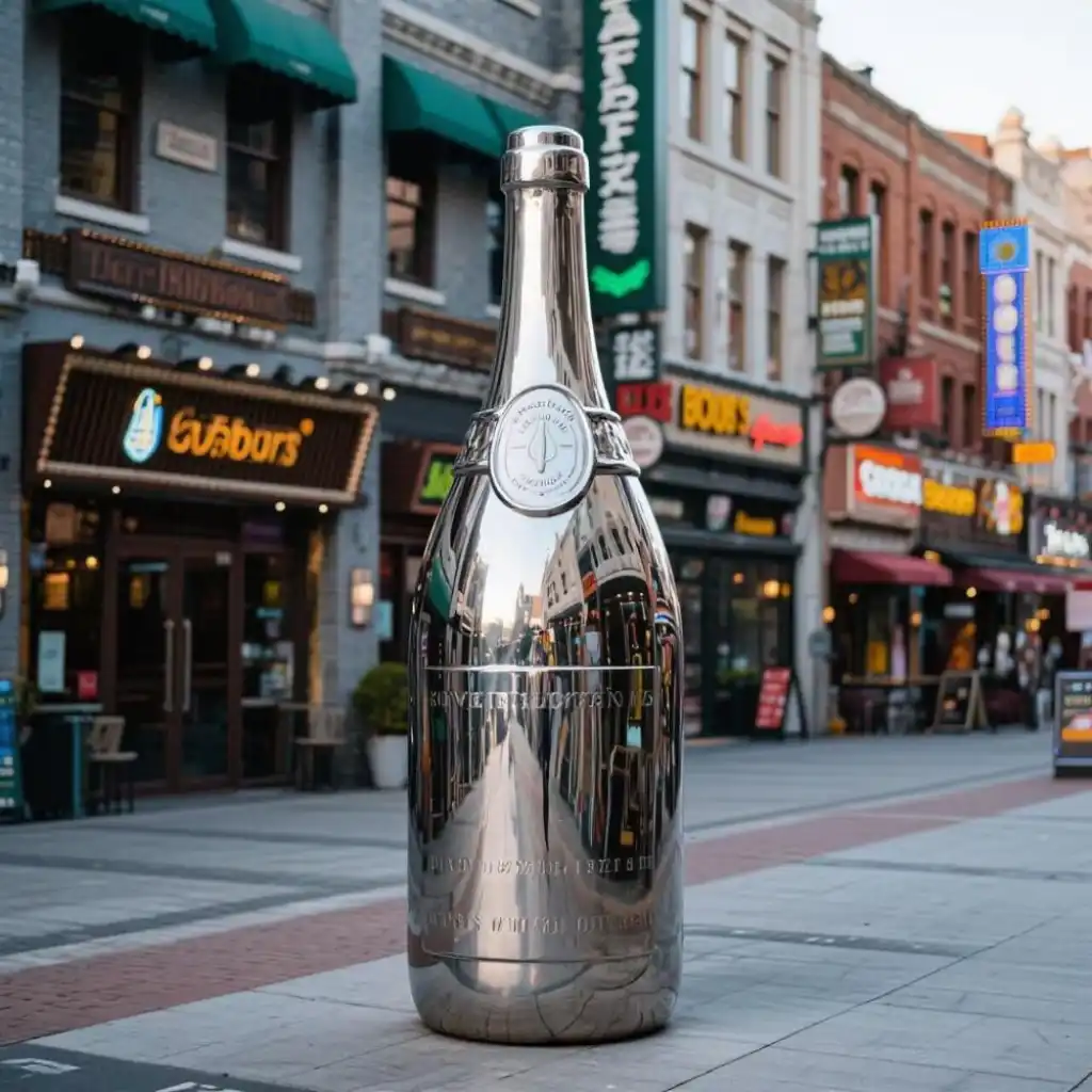 In the center of a modern cityscape, art and architecture meet in striking form. This wine bottle sculpture, crafted from mirror-polished stainless steel, turns any outdoor space into a conversation piece. Its bold silhouette, high-shine finish, and interactive reflections create an unforgettable experience.
